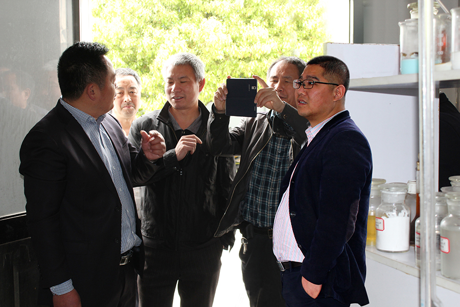 科星化工銷售總監(jiān)吳昌祥(左一) 在理化室,與五洲新春集團(tuán)領(lǐng)導(dǎo)著重介紹了在生產(chǎn)過程中如何對(duì)貨品取樣抽檢,以及對(duì)品質(zhì)全程把控的工序流程。富日泰俞總(右二)裘廠長(左二)森春有限公司陳總(右一)李總(右三)