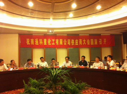 首先請代表們到公司參觀生產、研發、倉儲、辦公現場,在公司多功能會議室,代表們觀看了公司產、供、銷和公司發展史影像片,然后到主會場——海安王府賓館四樓召開了全體供應商會議,同時邀請了地方政府、金融系統領導一同參加。會上,吳總首先介紹了公司近年來發展情況,接著就原料的質量等問題提出了我公司的要求。最后由上海甲基、南京古田化工、泰州東興物資、南通仁和化工供應商代表發言講話。