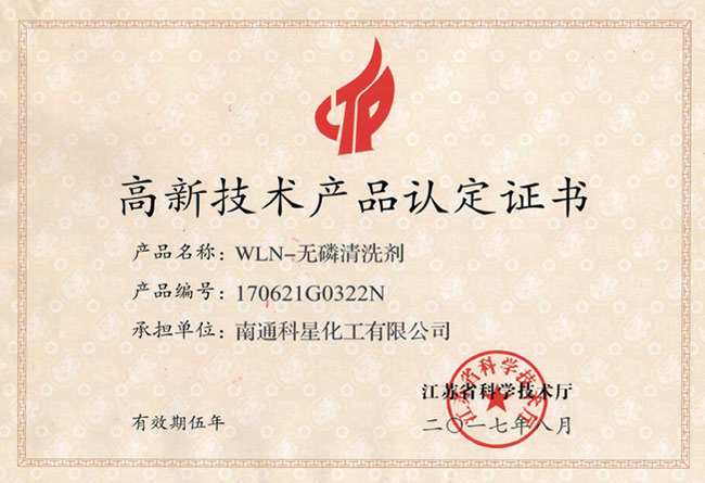高新技術(shù)產(chǎn)品認(rèn)定證書-WL-無磷清洗劑