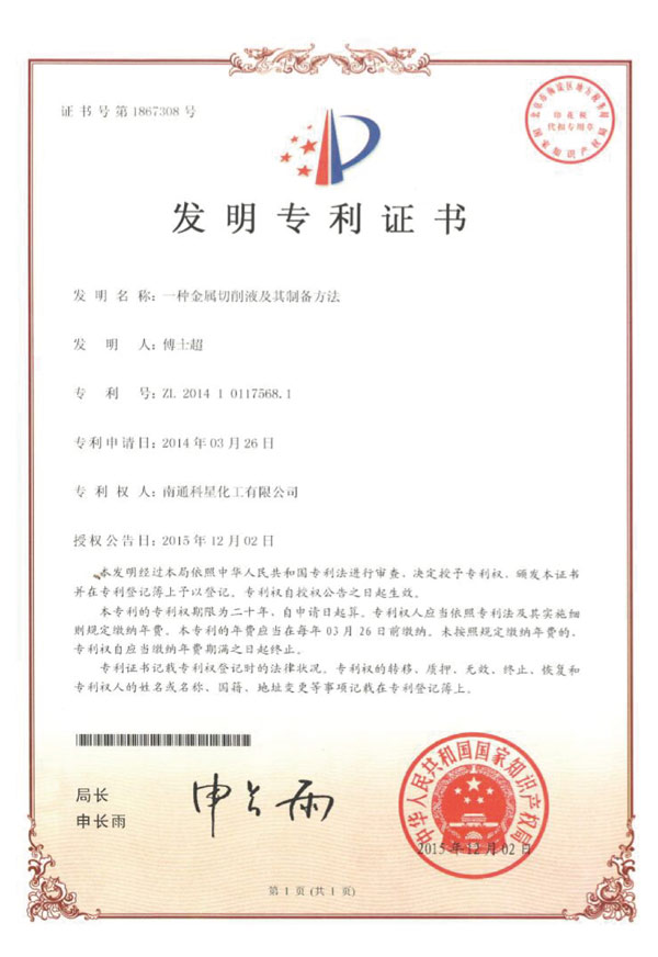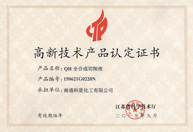 高新技術(shù)產(chǎn)品認(rèn)定證書-QH全合成切削液